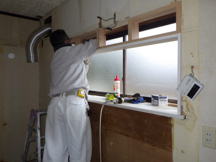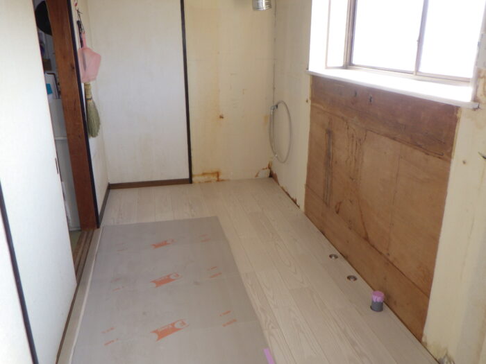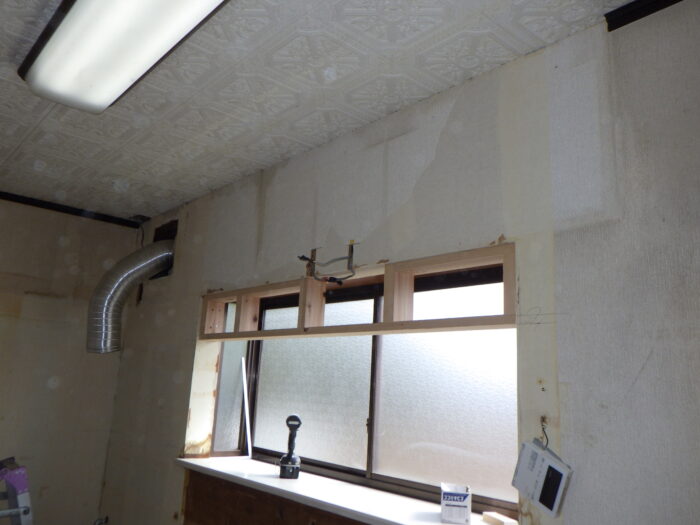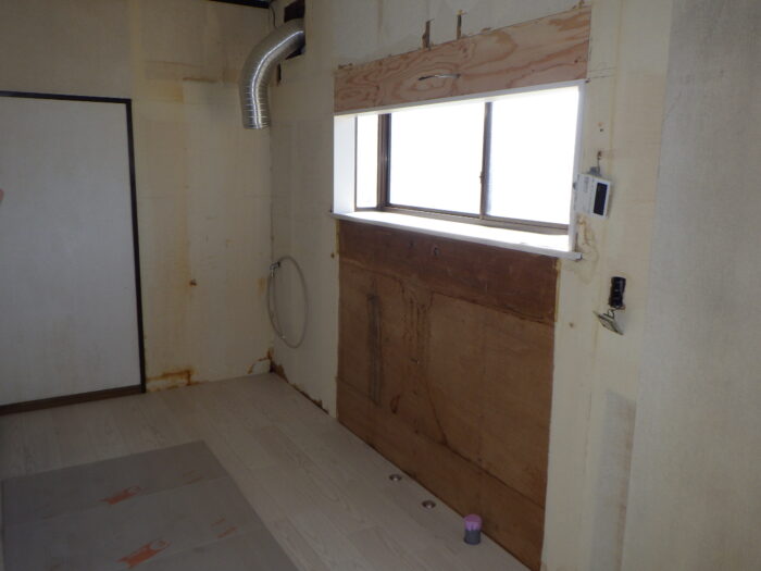 ≪下り壁・システムキッチン取付下地補強≫今までの吊り戸がH500タイプのため下り壁を取付てH700タイプにします。既設の壁を剥して吊戸棚や流し台の取付位置に木材を使い補強致します。吊戸棚もかなりの容量なので落ちたら大変です。補強が終わったらキッチンパネルの下地として、石膏ボードや構造用合板を張ります。