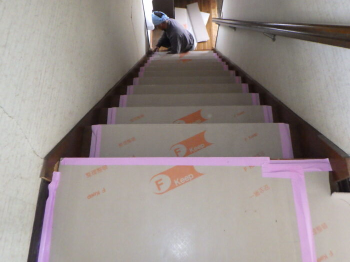 ≪システムキッチン解体撤去≫キッチン解体をする前に、階段やキッチン、リビングなどの運搬経路を養生材、養生シート、養生テープを使い壁や床に傷が付かないようにします。そして収納扉、下台、キッチンカウンター、換気扇、吊り戸の順に解体撤去致します。