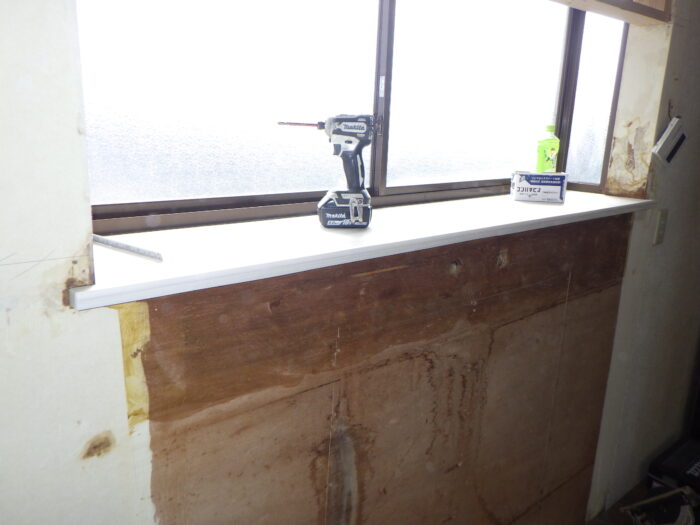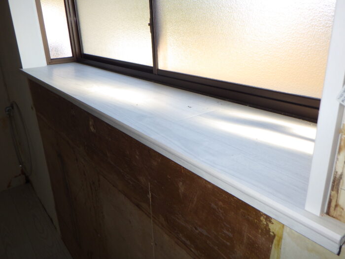 ≪出窓カウンター工事≫既設の出窓カウンターがステンレスでした。ステンレスの汚れや腐食が目立っていたので、タイルフロアを張りカバー致しました。ステンレスの小口も見切り材を使いタイルフロアで納めました。