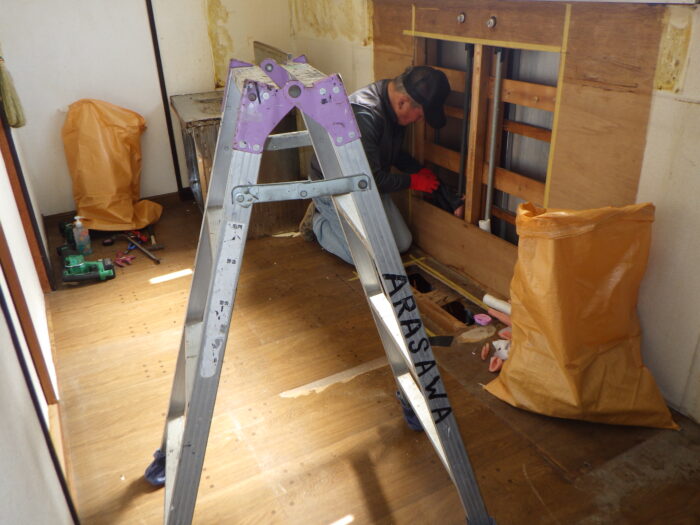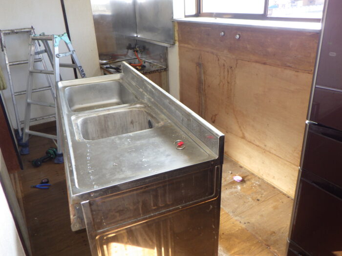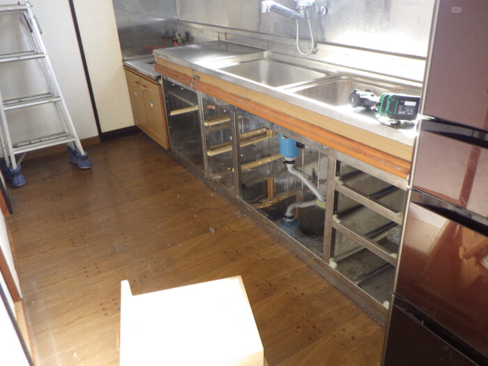 ≪流し台・ガスコンロ台撤去≫給湯・給水・排水を外し、流し台を撤去致します。ガス台を撤去する前にガス屋さんにガス配管の撤去を依頼いたします。特に都市ガスの場合には、日にちがかかる場合がありますので事前に打ち合わせが必要になります。