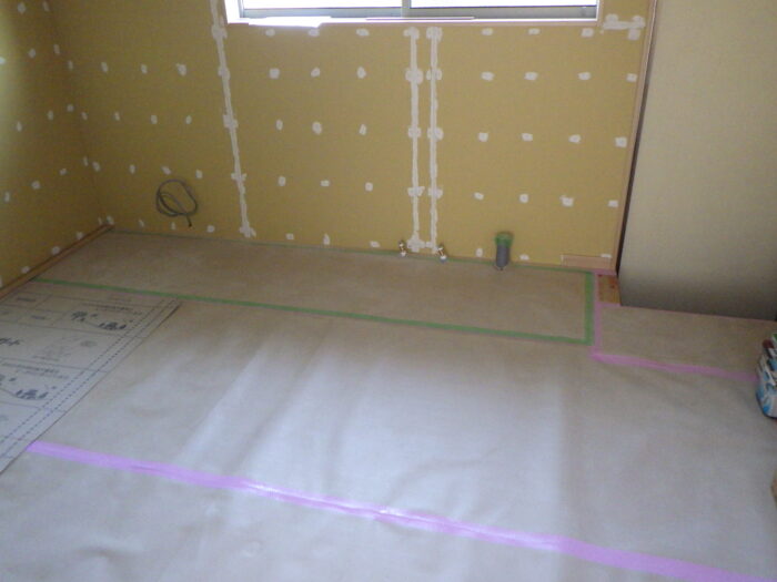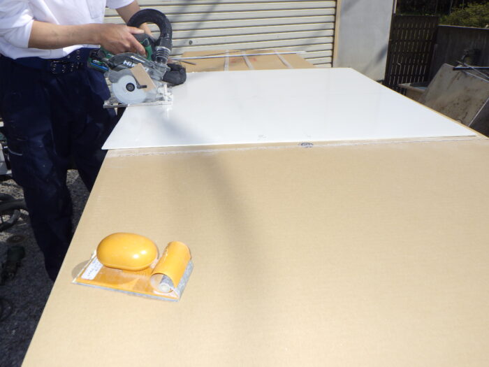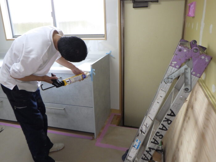 ≪コーキング・シーリング工事≫キッチンパネルやシステムキッチンを取り付ける場合には、コーキング工事・シーリング工事が必要になります。マスキングテープを貼り、コーキングを継ぎ目や隙間に充填、ヘラで抑えて平らに致します。