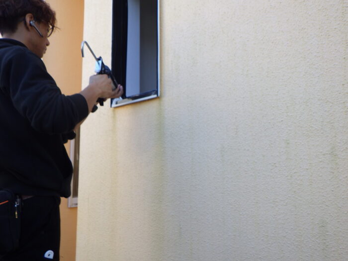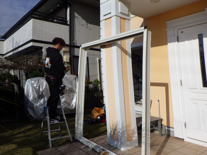 ≪既設アルミ枠処理≫残った既設サッシ枠に気密テープを貼っていきます。尚、ビス穴などは、コーキング材やシール材を注入し気密をとって処理します。 新しい枠を乗せる前に今の枠に気密テープを貼り、止水をします。リプラスの施工は今の枠はそのままに上から枠をかぶせるカバー工法です。