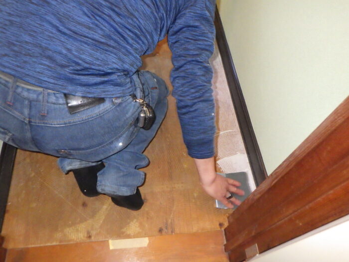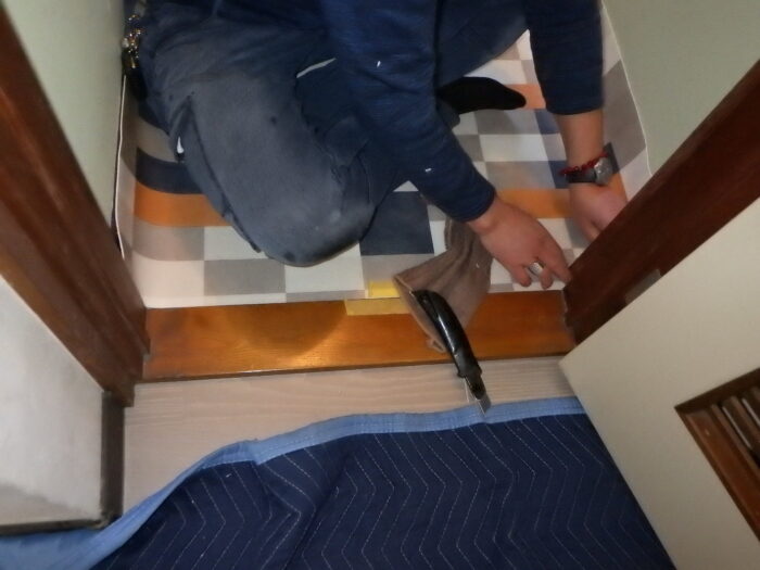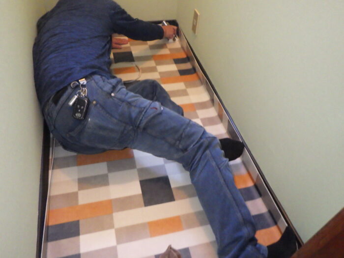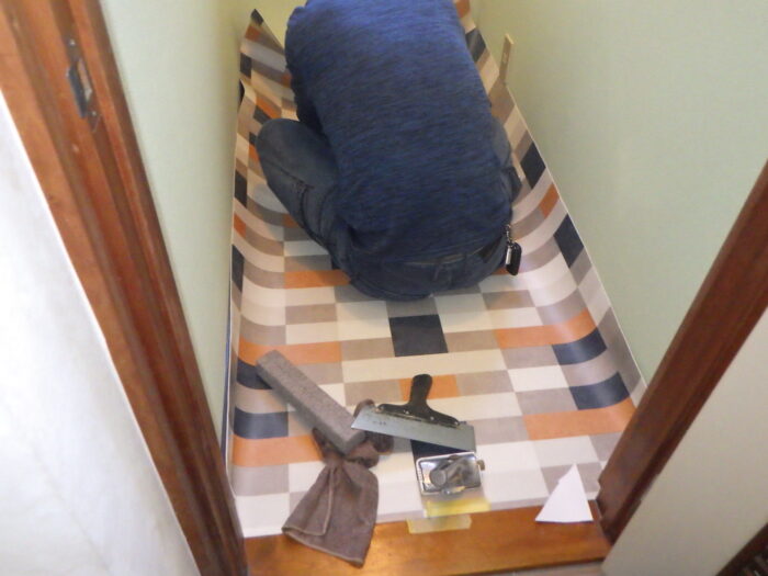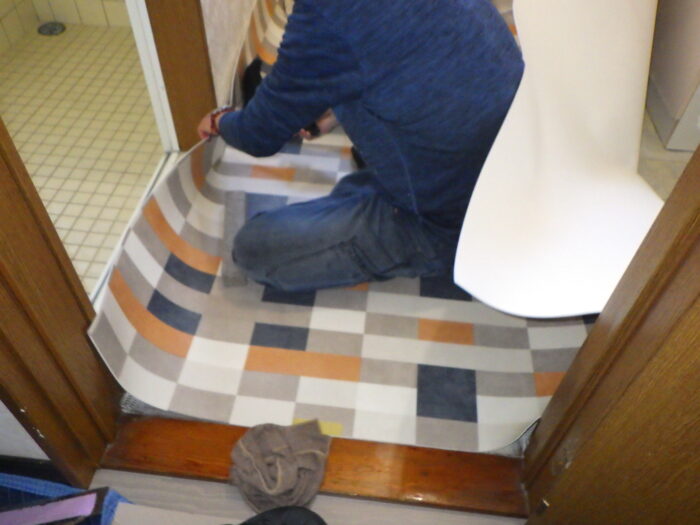 ≪クッションフロア圧着≫あらかじめシートを、できるだけ空気が入り込まないように敷き込み、内側から外側にゆっくり戻し、そしてエアー抜きハケを使い、体重をかけながら外側に向かってエアーを抜きます。