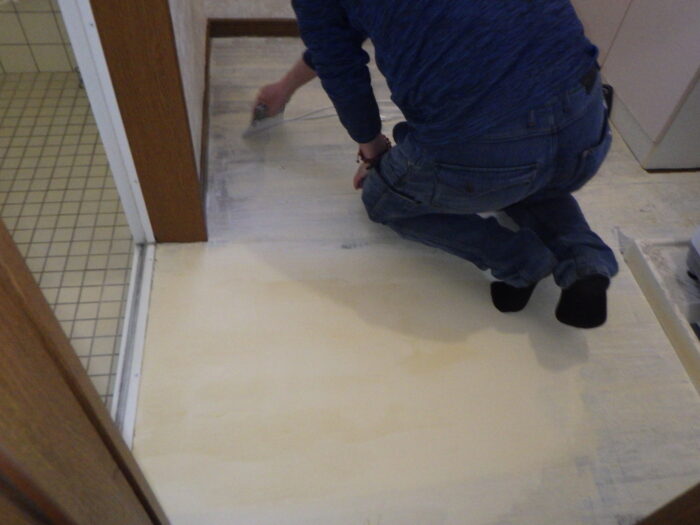 ≪トイレクッションフロア張替え・接着剤塗布≫クッションフロア専用の接着剤を使用し、床に接着剤を出しクシベラを使って櫛目を立てながら伸ばしていきます。面積の半分くらい塗ったらクッションフロアを戻し、また反対側も接着剤を塗っていきます。