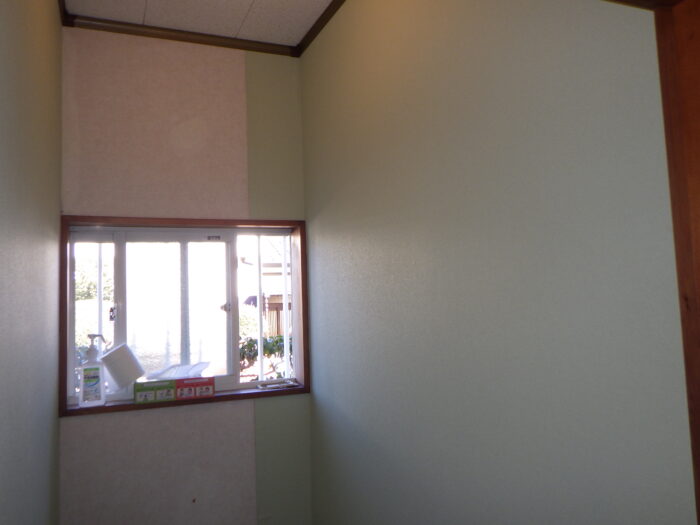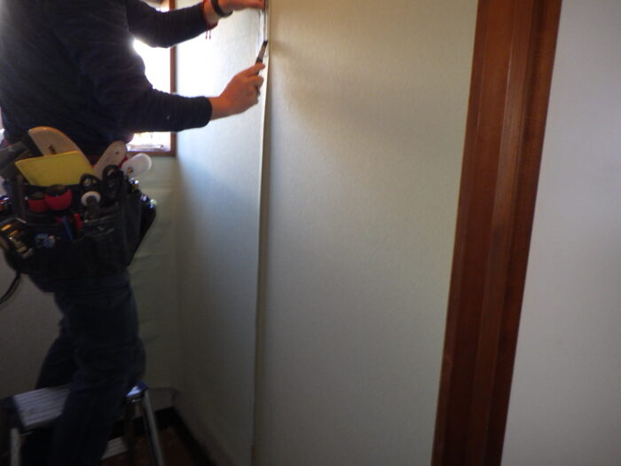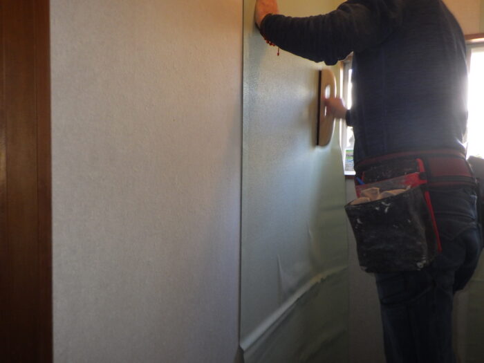 ≪パテ下地調整≫下地処理というのは壁紙を張る時に一番重要な作業になり、大切な工程で丁寧に仕上げなければ、仕上がりが悪くなります。 石膏ボードの継ぎ目があるのが手で触っても分からない位のレベルにします。石膏ボードが浮いている場合には、新たにビス止めしていきます。