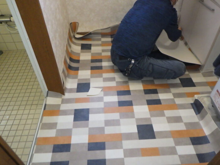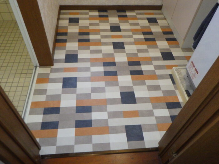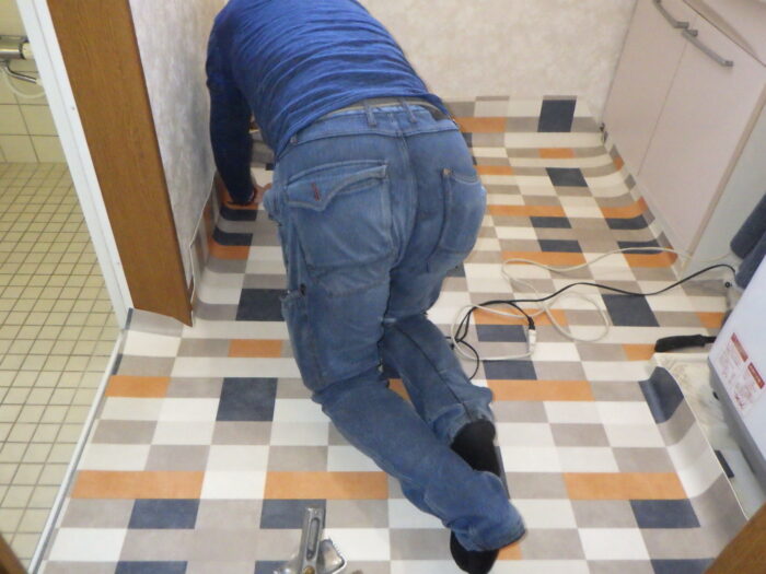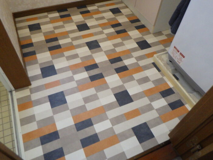 ≪洗面脱衣室クッションフロア張替下地処理≫クッションフロアや長尺シート・タイルフロアなどの床材を張り替えるには、下地処理や下地調整を行う必要があります。この工程を丁寧に行わなければ、施工が上手くいかず凹凸になってしまいます。