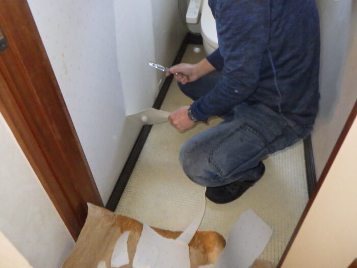 ≪クロス紙剥がし工事≫クロス紙剥がしは一般的にスクレッパーで剥がします。 商品や貼った状況や条件によって剝がれにくい場合もあります。クロス紙はもともと2層構造になって表面の1層だけが剥がれ2層目の白い紙だけが残る仕組みになっております。