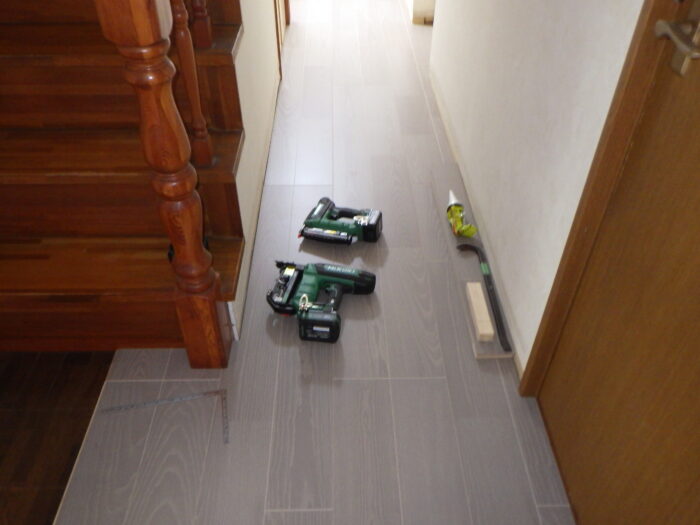 ≪フローリング床用フロアタッカー≫フロアタッカーは、エアーコンプレッサと接続して空気圧により、ステープル釘を打ち込みする専用のエアータッカーです。今は、コードレスタッカーなどがあります。ステープルを打つ場所は、根太に目掛け打つことがポイントになります。根太を外すと釘がこすれ床鳴りの原因になります。