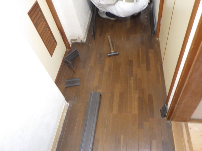 ≪巾木脱着≫床張り替えの場合には、既存の巾木か脱着できる場合には、脱着をするときれいにフローリングも納まります。巾木が外せない場合には、カンナなどで削って擦り付ける事になり、床鳴りの原因にもなってしまいます。
