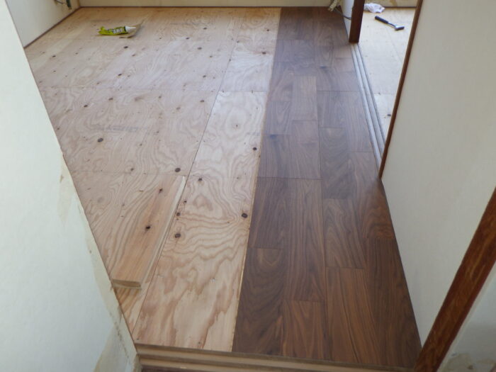 ≪フローリング下地用捨て貼り合板≫ここでのポイントが捨て貼り合板になります。昔のフローリング下地は根太材だけだったので年数がたつとブカブカになってしまいました。必要に応じ、床断熱材の敷き込みを行い、そしてフローリグの強度を高めるために捨て貼り合板を張っていきます。