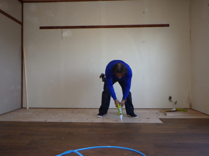 フローリング張り手順≫フローリングの張り方は、部屋全体の縦寸法、横幅寸法を測りだしフローリンが左右、上下が対象になる様に張って行きます。そして床なり防止に、フローリング専用接着剤を使用し施工致します。