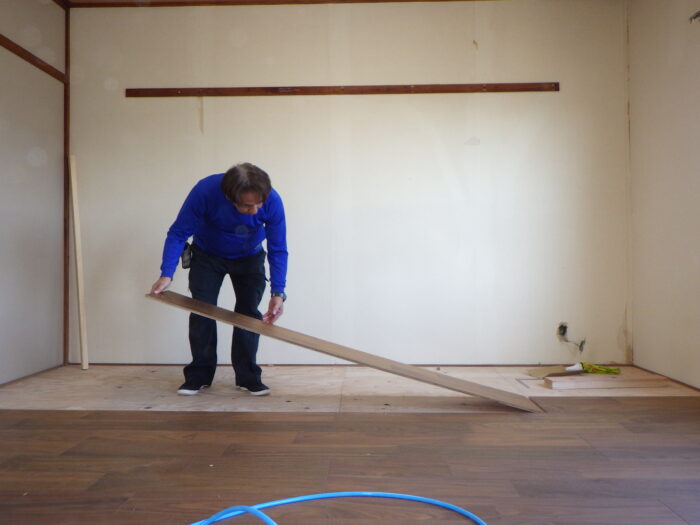 ≪フローリングの加工≫リフォーム工事の場合は新築と違い、既存の巾木や畳寄せに突付けて施工する事になり、何度も鉋などで削りながら微妙に調整していきます。従って新築のフローリング張りよりも時間が必要になってきます。