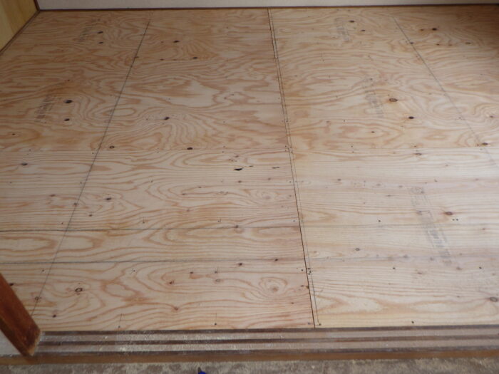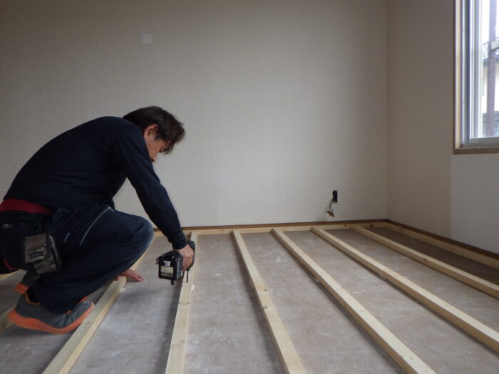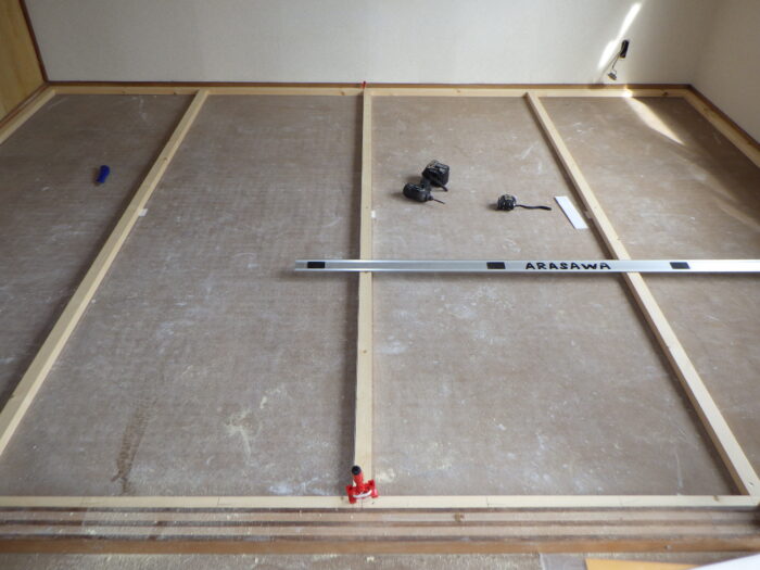 ≪床下地組≫和室は畳の厚みだけ床の位置が下がっているので床の高さを調節する必要があります。手順としては、和室畳を撤去し、根太材を303ピッチに根太組を行います。必要に必要に応じ、床断熱材の敷き込みを行い、そしてフローリグの強度を高めるために捨て貼り合板を張っていきます。