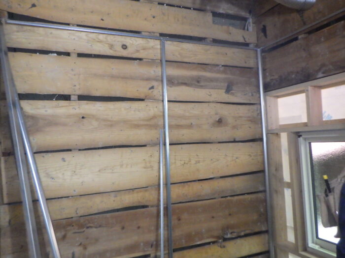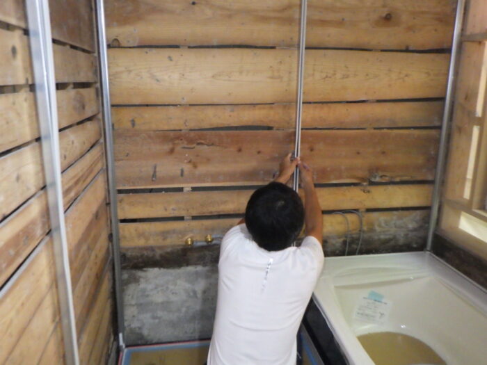 ≪ユニットバス骨組み≫ユニットバスの枠を立てている所です。まず最初に縦枠を固定致します。その縦枠を横枠で繋いで固定します。この枠に壁をはめていきます。