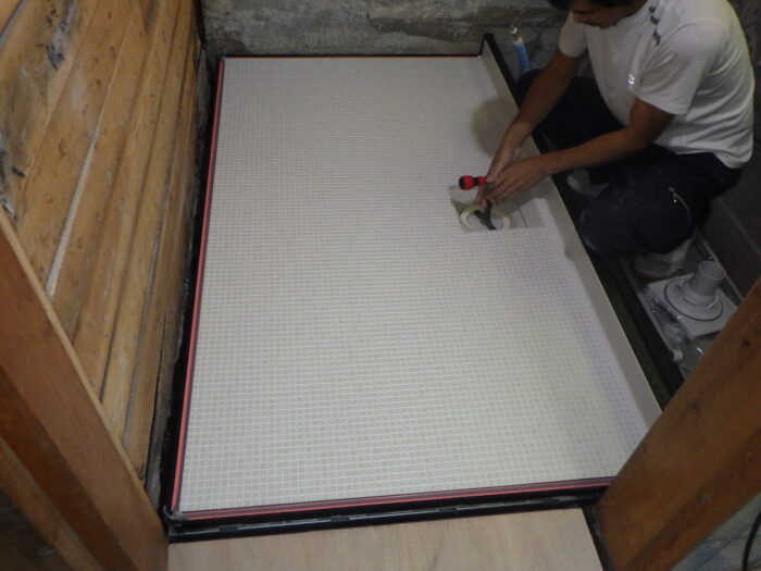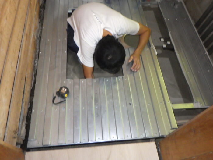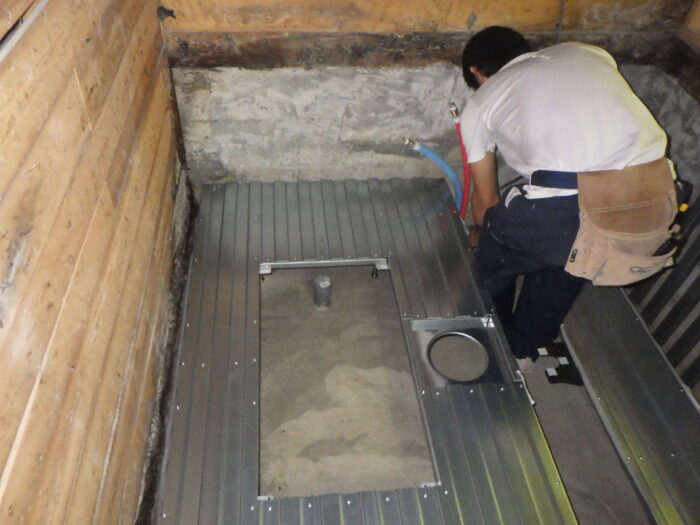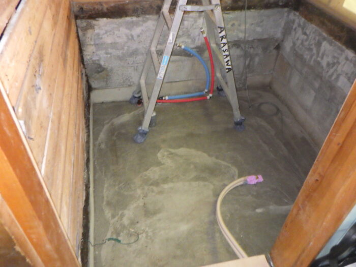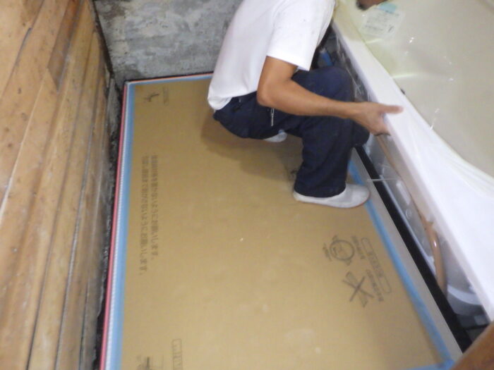 ≪ユニットバス架台組立≫2分割になった架台をセットするのですが、高さ及び配置が少しでもズレてしまうと、納まりが悪くなるので慎重に行います。TOTOサザナは、架台の高さが3種類あるのでさまざまな現場に対応可能することが出来ます。