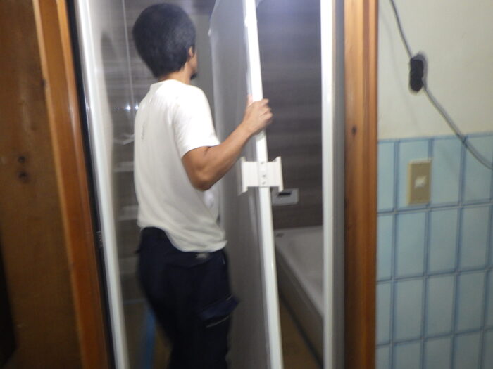 ≪ユニットバス片開きドア取付工事≫片開きドアを取り付けます。今回は、ドアの幅や高さを最大限にいたしました。幅が800高さが2150になります。折れ戸、開き戸、引き戸などゴムパッチンのないスッキリがお選びいただけます。