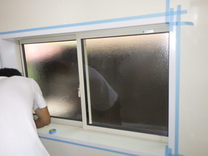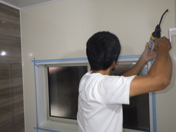 ≪窓化粧枠コーキング工事≫窓のアタッチメントや窓枠を加工取付します。防水性を高めるために窓周りには養生テープを貼り、コーキングを使い仕上げていきます。