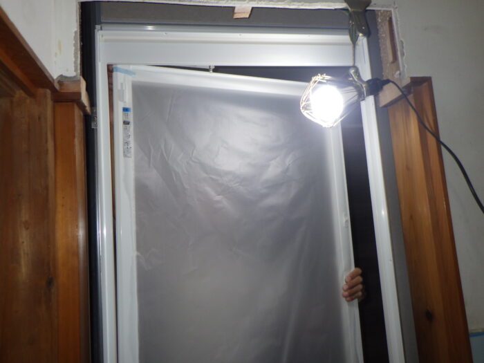 ≪ユニットバス入口ドア枠加工取付≫今回は、樹脂製のフクビユニットバス枠、幅165の4方枠を使います。ドア寸法を大きくしてクロス工事が必要ないように納めました。