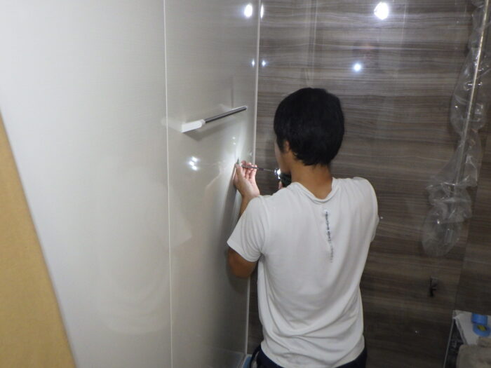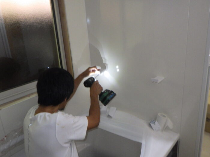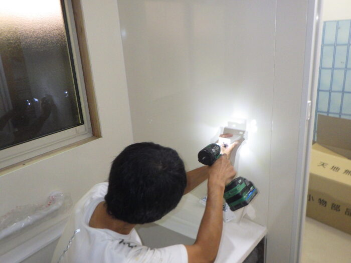 ≪給湯器リモコン取付≫給湯器交換や給湯器リモコンの取付を行います。リモコンの取付もパネル加工時にあらかじめ下穴を加工しビスで留めます。固定出来たらコーキングをします。