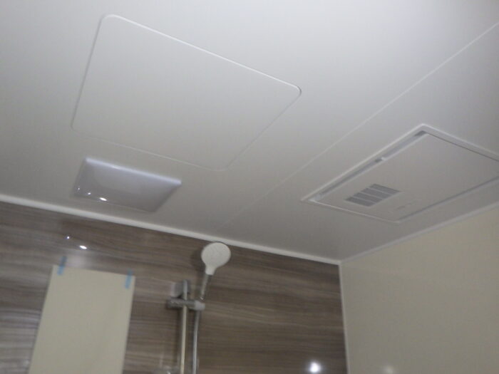 ≪天井施工≫あらかじめ換気扇を取り付けた天井板を取り付けます。天井も施工しやすいように2分割になっております。天井が出来たら照明器具や点検口の蓋を取り付けます。