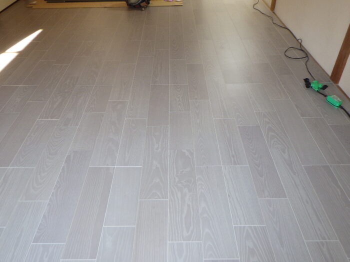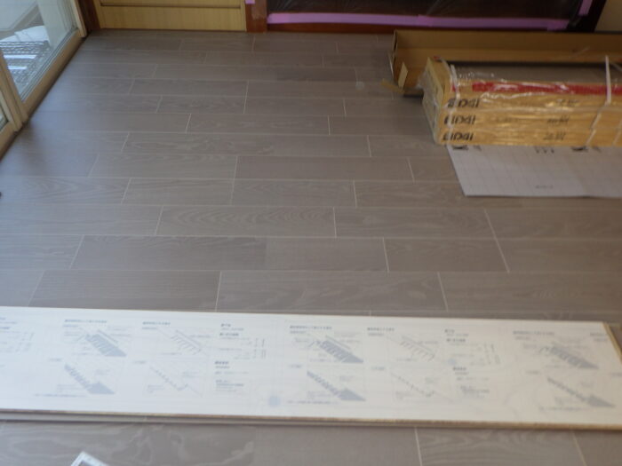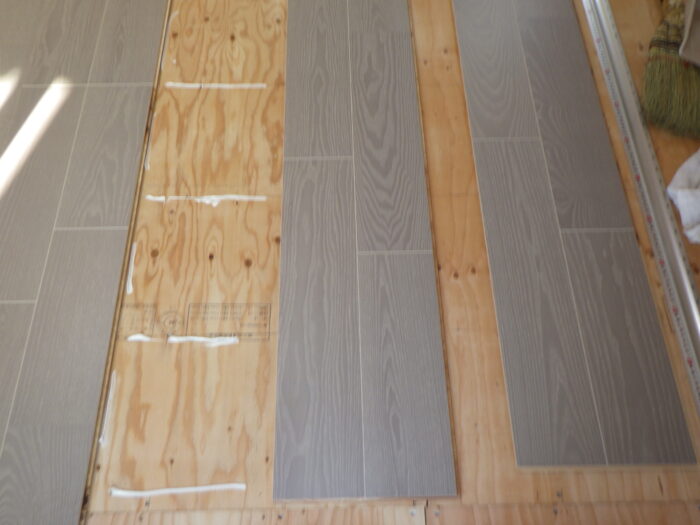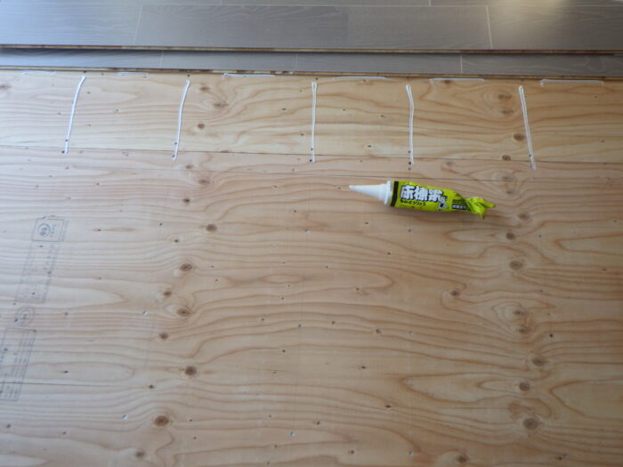 ≪フローリング張り手順≫フローリングの張り方は、部屋全体の縦寸法、横幅寸法を測りだしフローリンが左右、上下が対象になる様に張って行きます。そして床なり防止に、フローリング専用接着剤を使用し施工致します。