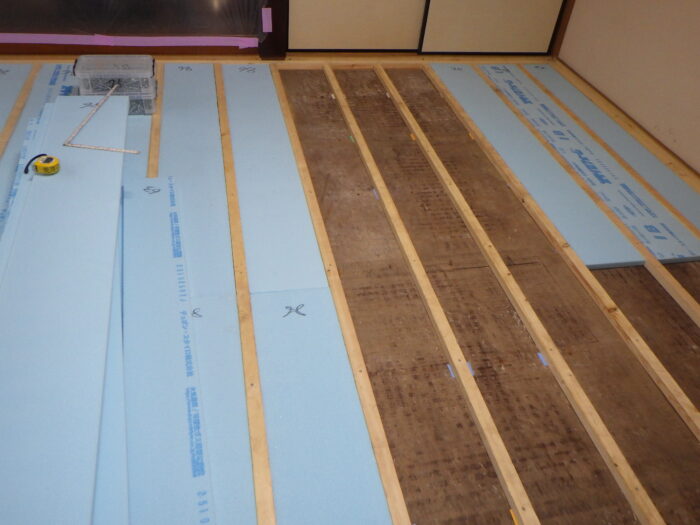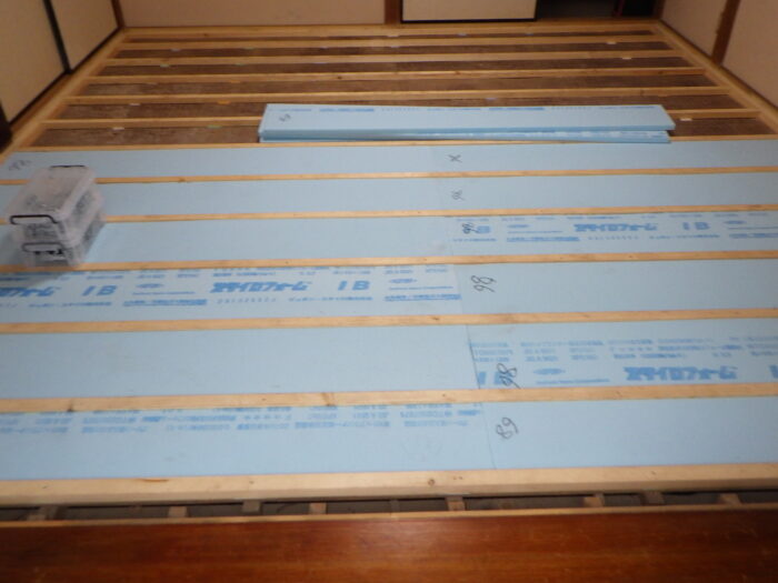 ≪床断熱材敷き込み≫寒さ対策として床の断熱工事になります。床断熱材の種類もグラスウール断熱材や発泡スチロール系の断熱材があり用途と現場状況により考え使用いたします。今回は、発泡系を使い根太と根太の間にカットし施工して行きます。
