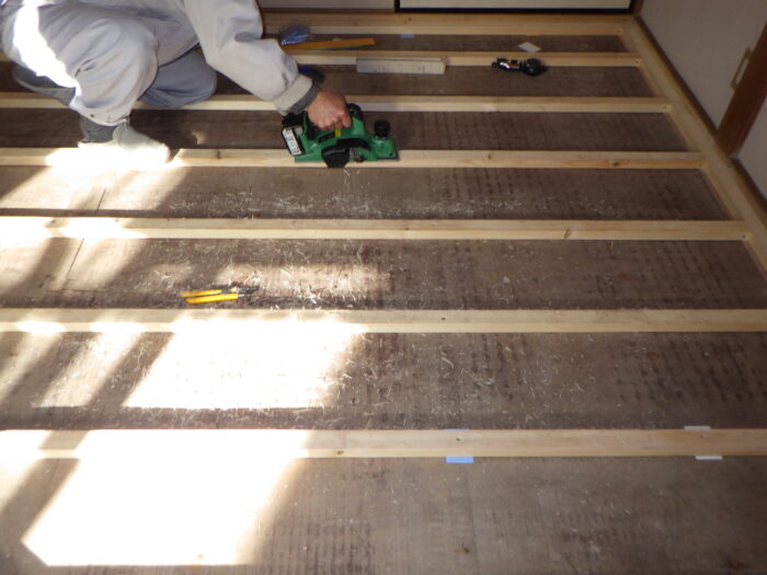 ≪フローリングの加工≫リフォーム工事の場合は新築と違い、既存の巾木や畳寄せに突付けて施工する事になり、何度も鉋などで削りながら微妙に調整していきます。従って新築のフローリング張りよりも時間が必要になってきます。