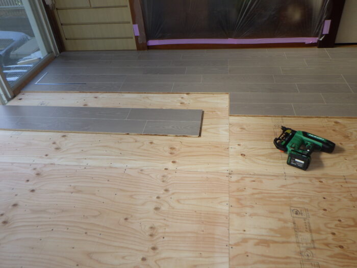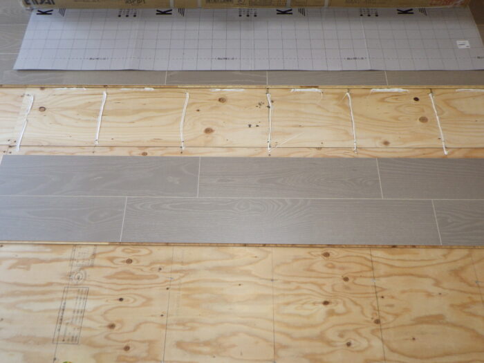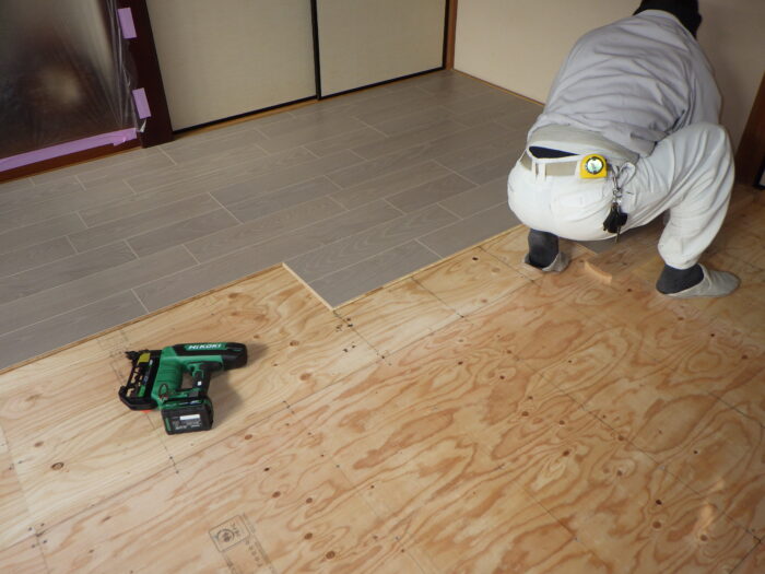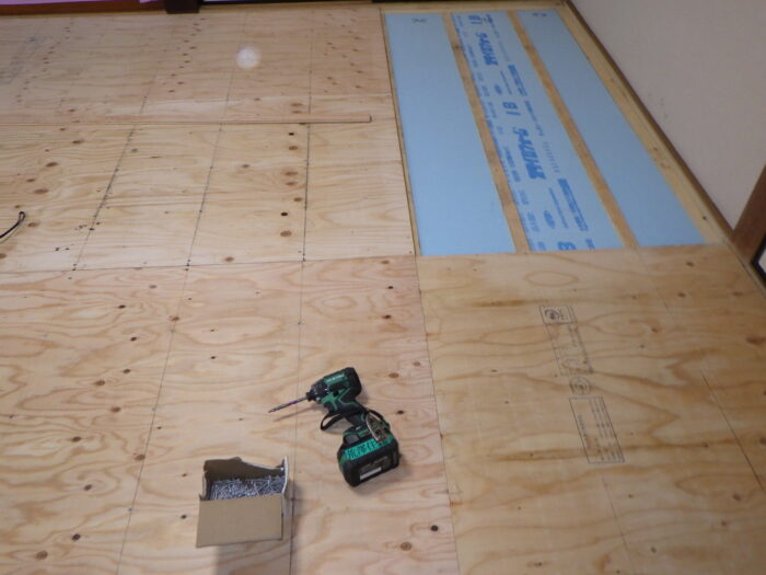 ≪フローリング下地用捨て貼り合板≫ここでのポイントが捨て貼り合板になります。昔のフローリング下地は根太材だけだったので年数がたつとブカブカになってしまいました。重ね張りをする事で丈夫になります。