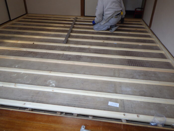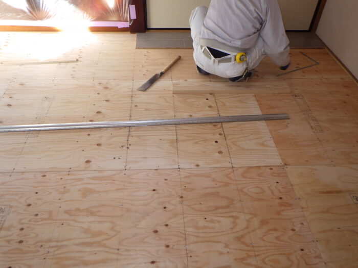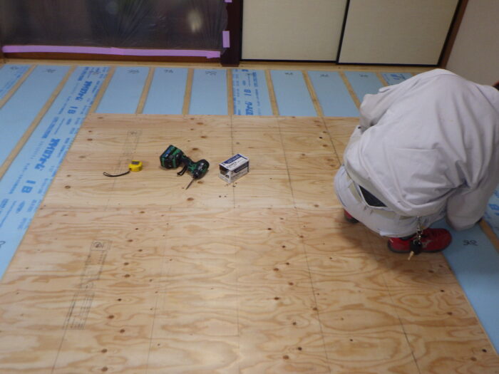 ≪床下地組≫和室は畳の厚みだけ床の位置が下がっているので床の高さを調節する必要があります。手順としては、和室畳を撤去し、根太材を303ピッチに根太組を行います。必要に必要に応じ、床断熱材の敷き込みを行い、そしてフローリグの強度を高めるために捨て貼り合板を張っていきます。