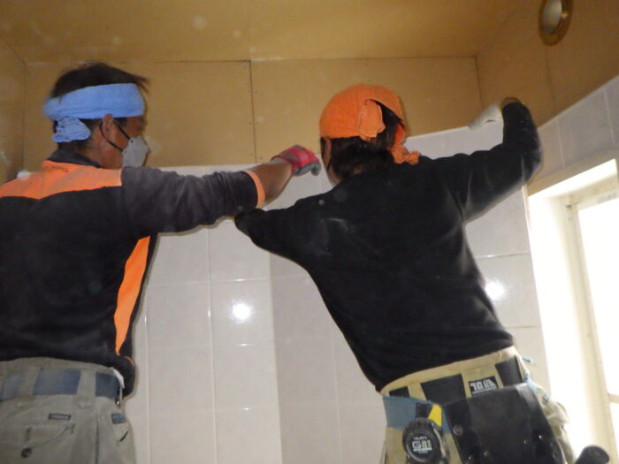 ≪フローリング張り≫フローリングの張り方は、部屋全体の縦寸法、横幅寸法を測りだしフローリンが左右、上下が対象になる様に張って行きます。そして床なり防止に、フローリング専用接着剤を使用し施工致します。