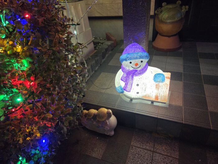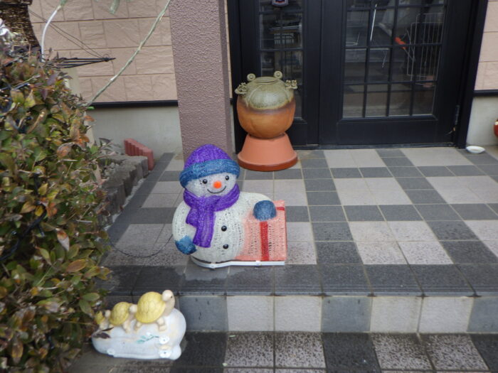 ≪スノーマン≫スノーマンは、少しちっちゃめですが、可愛いです。スノーマンの後ろにあるカエルの置物も6匹になって迎えるという意味のカエルです。