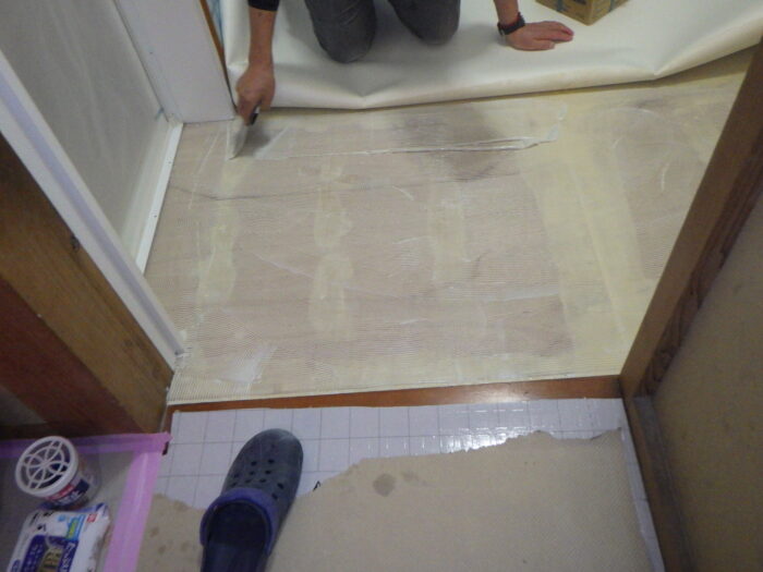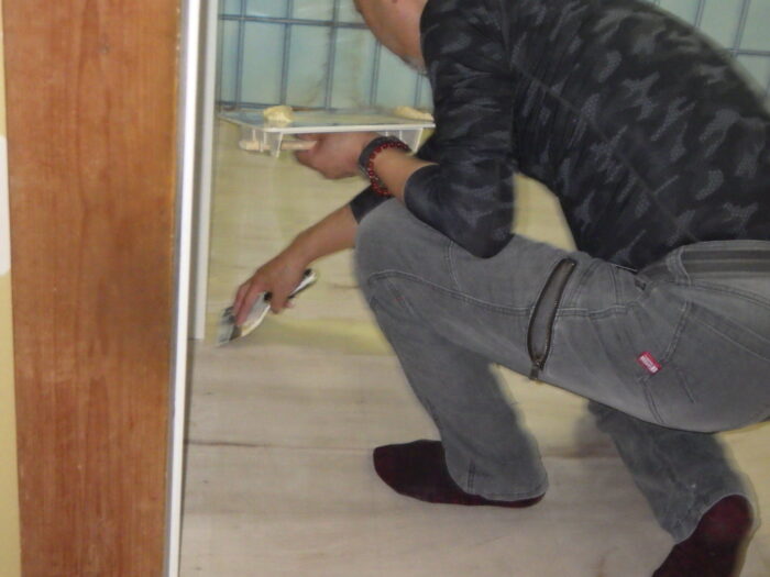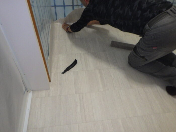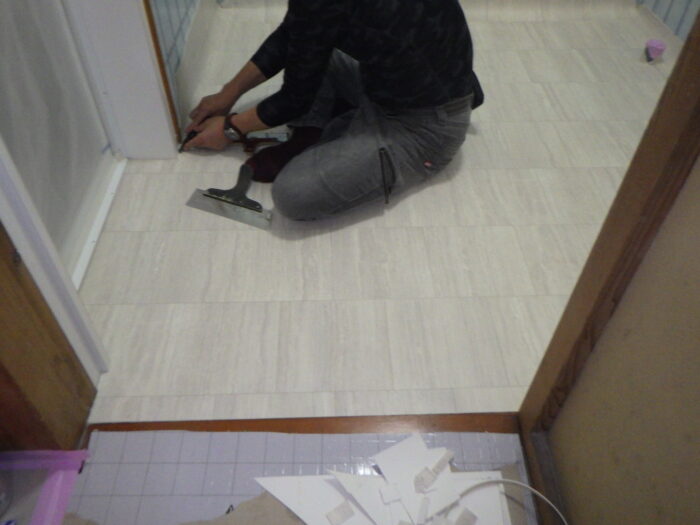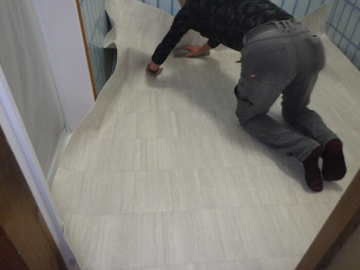 ≪クッションフロア圧着≫あらかじめ、シートを内側から外側にゆっくり戻し、エアー抜きハケを使い、体重をかけながら外側に向かってエアーを抜きます。