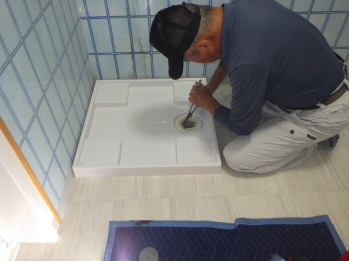 ≪洗面化粧台・洗濯防水パン取付工事≫既設の洗濯防水パンが大きく洗面化粧台との間隔かなかったので、最近の小さめサイズ洗濯パンに交換し洗面化粧台と洗濯機のスペースを取る事ができました。
