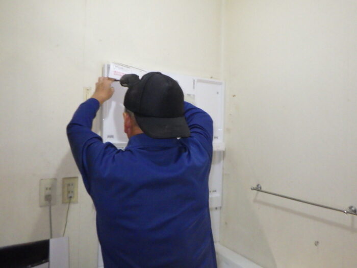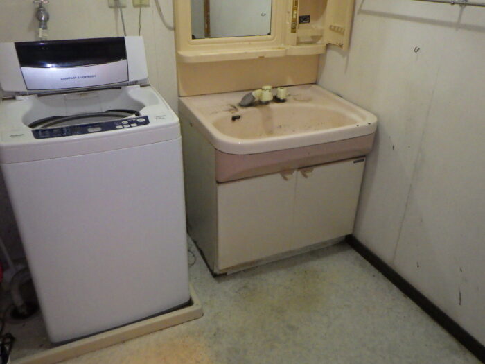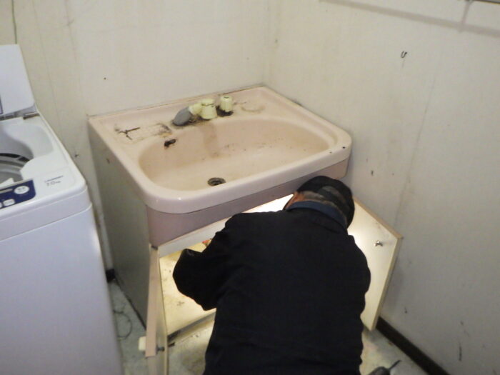 ≪既設洗面台撤去工事≫まず最初に水道管の栓を閉めます。洗面台取付場所が2Fなので溜まり水を1Fの蛇口を開けて出し切ります。そして既設洗面化粧台の止水栓、排水管を外して本体の固定ビスを外せば撤去出来ます。