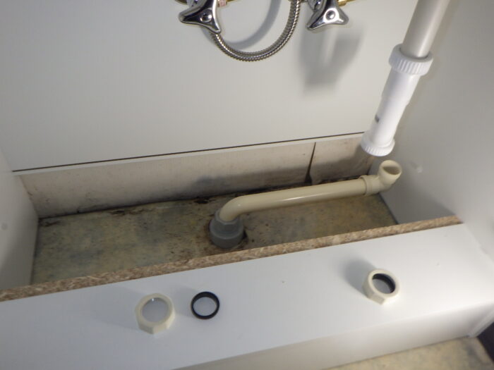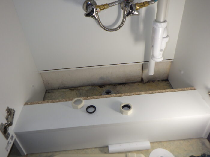 ≪洗面台取付工事≫洗面化粧台交換の際、加工する箇所がいくつかあります。最初に巾木がある場合には、巾木をカットするか洗面台をカットするかになります。後は給水管・給湯管・排水管の出る位置わ穴あけ加工が必要になります。