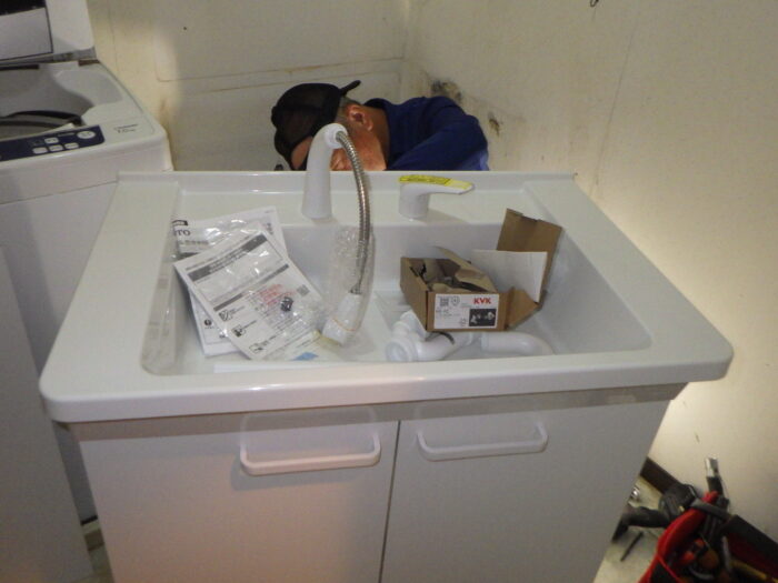 ≪給水管・給湯管・排水管工事≫ハンドル型止水栓と持ち出し配管を新しい止水栓と持ち出し配管に交換。排水管は、既設の給排水位置を変えずに取り替えができるリモデルユニットを使用する事に致しました。