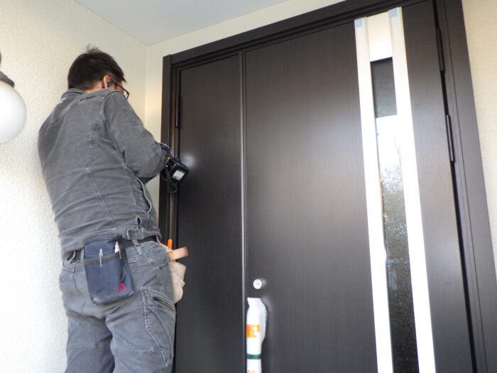 ≪枠取付≫枠やドアは、特注になるため事前に寸法確認して発注致します。発注後、2週間で製品が出来上がります。既設の枠に新設の枠をはめ込み、水平器を使用し水平、垂直を確認しスペーサーで調整し固定していきます。
