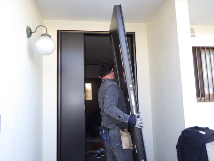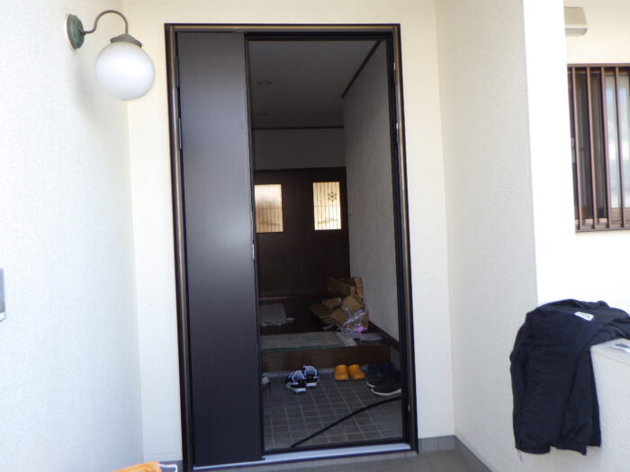 ≪リシェント玄関ドアとは≫既存の玄関ドア枠の上に新しいドアを枠ごと取り付けるカバー工法という方法で施工しますから、壁や床などを壊さずに施工できるので1日でリフォームが完了いたします。