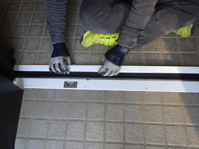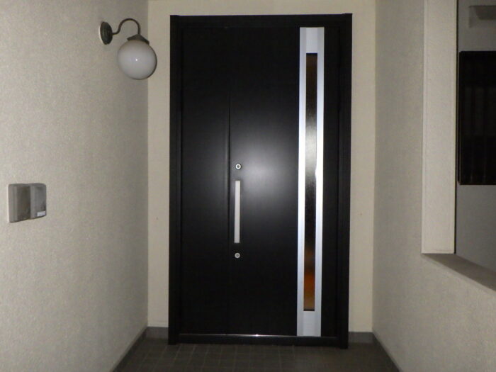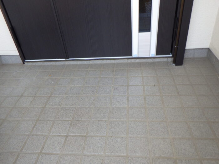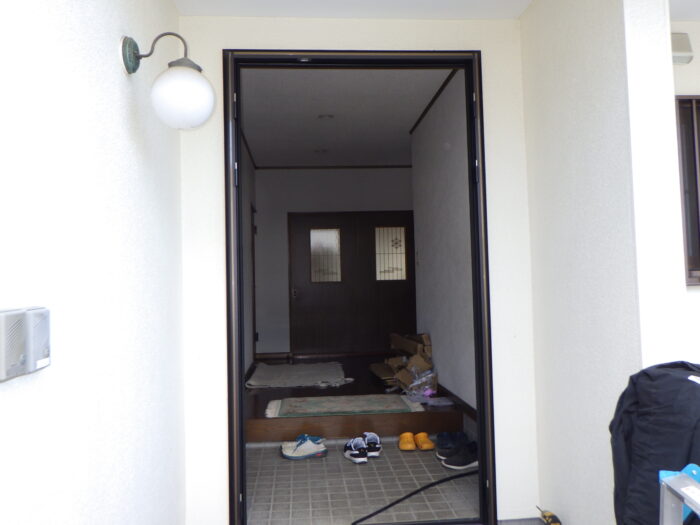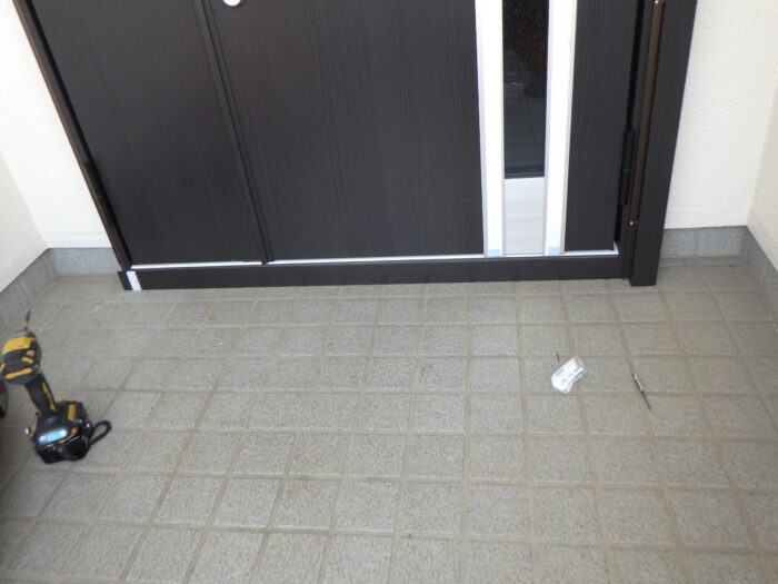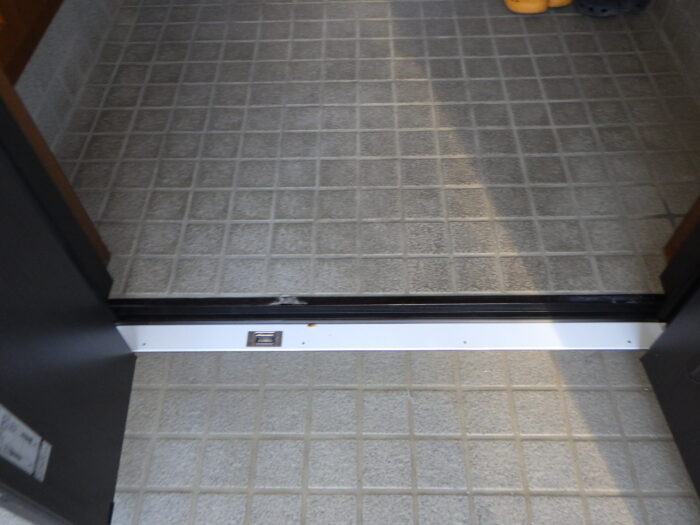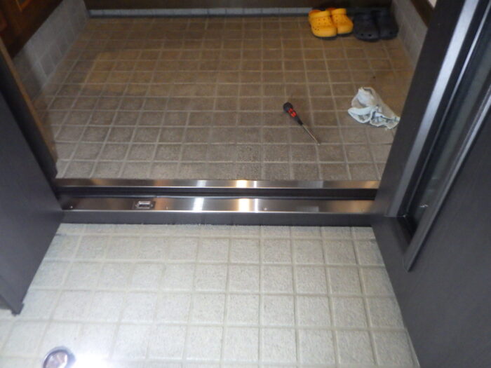 ≪玄関下枠段差緩和材及びステンレスカバー≫通常はゴムの下枠段差緩和材だけをします。今回は、床の傷や穴を隠す意味もありステンレスカバーを取付けキレイに仕上がりまた。
