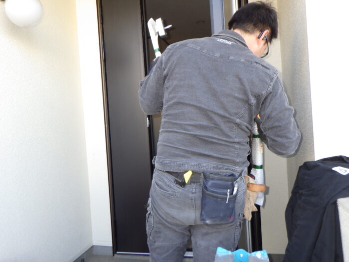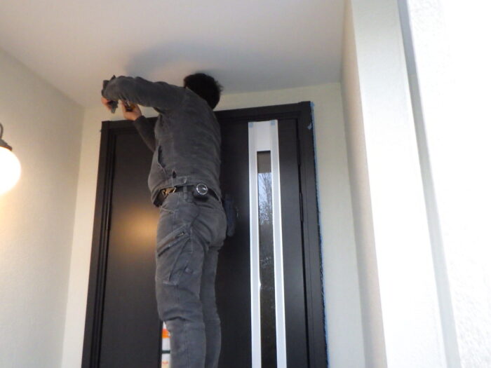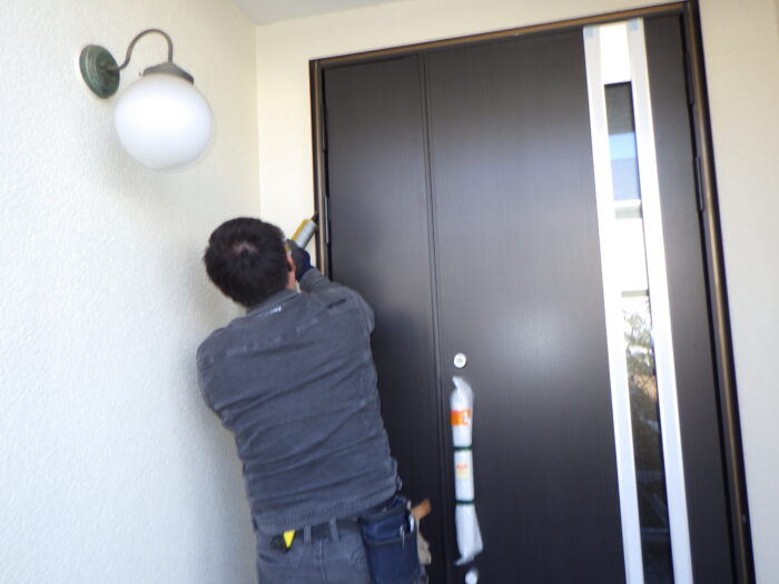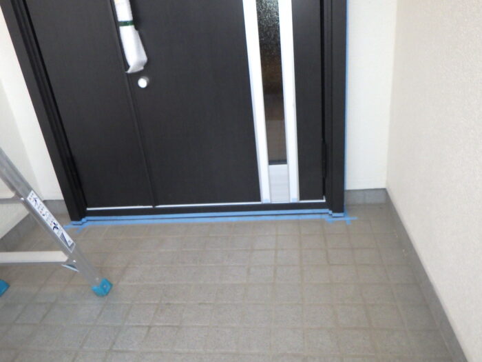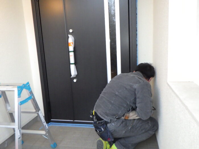 ≪コーキング工事≫外壁と玄関枠の取り合い部に雨水が侵入しないようにコーキングを打ち込みます。マスキングテープを丁寧に貼りコーキングベラで押えます。ポイントは、凸凹にならないように一気に一息で平らに撫でる事です。