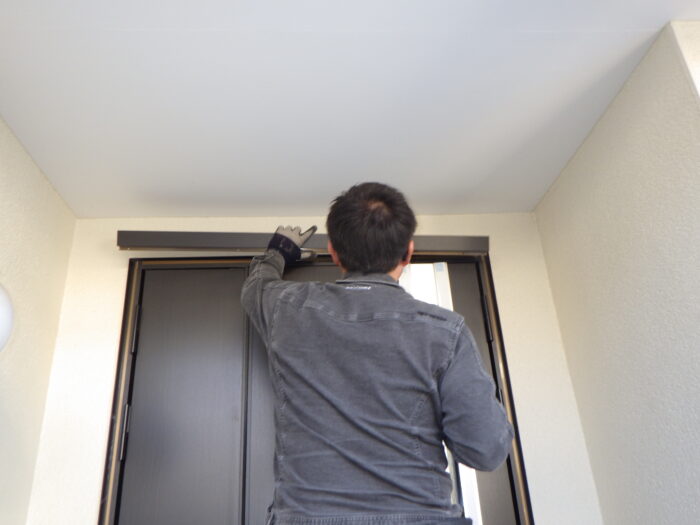 ≪飾り化粧枠取付≫外壁と玄関枠の化粧枠取付。枠の幅は現場加工になっており、丸ノコやアルミカッターを使い加工します。リシェントなら、壁を壊さず外側と内側に額縁を取付けるだけなので1日でリフォームできます。