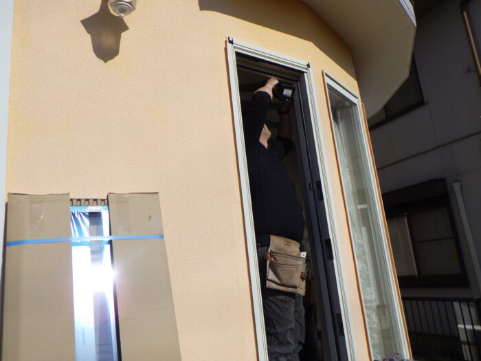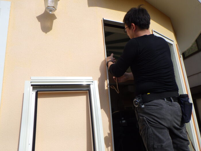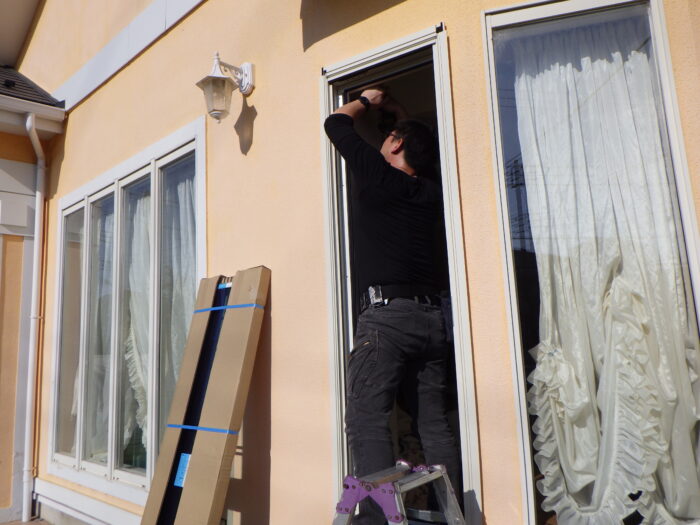 ≪既設アルミ枠処理≫残った既設サッシ枠に気密テープを貼っていきます。尚、ビス穴などは、コーキング材やシール材を注入し気密をとって処理します。 新しい枠を取り付ける前に今の枠に気密テープを貼り、止水をします。リプラスの施工は今の枠はそのままに上から枠をかぶせるカバー工法です。