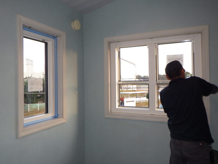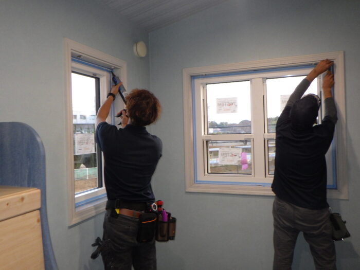 ≪室内側気密工事≫室内側も外側と同じように気密テープとコーキングを併用し気密工事を行います。メーカー指定の材料を使い、メーカー施工マニュアルに沿って完璧に行います。