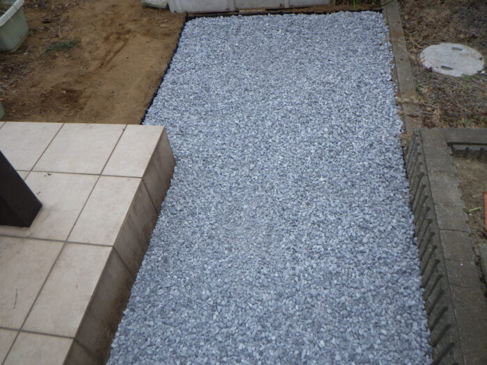 ≪砕石地業≫今回は駐車場に適したもC40-0を使用いたしました。40mmサイズの砕石と砂状の砕石が混ざっているので. 締め固めやすく駐車場向けとなります。駐車場以外だと、6号砕石が13mmから5mmの粒になりちょうど良い砕石になります。敷き均し厚みを場所により30mm~60mmにし平均で40mm位が、スムーズに歩きやすいお庭になります。