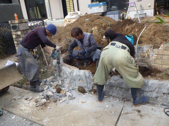 ≪ブロック解体撤去≫要所に合わせ振動ドリルやディスクサンダーなどを使い既存のブロック塀を解体していきます。コンクリートハツリ機では作業時間がかかり大変なので、要所以外は大ハンマーでたたき壊したほうが早く壊す事が出来ます。