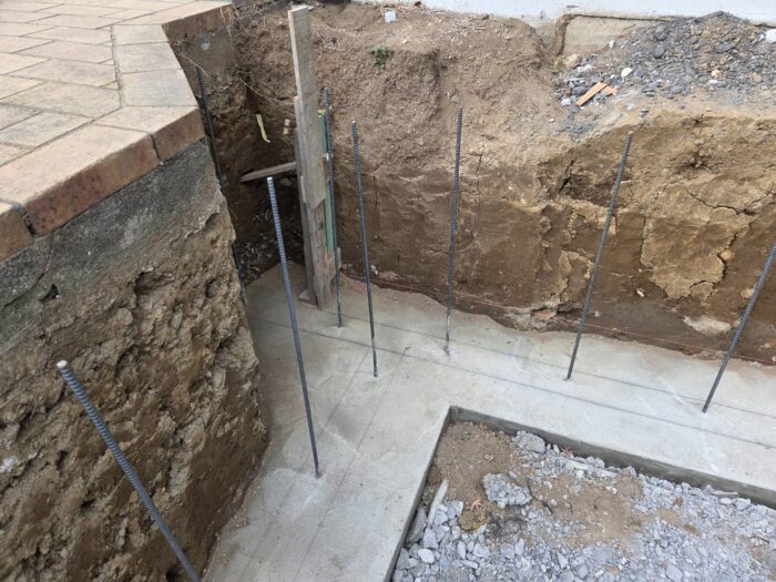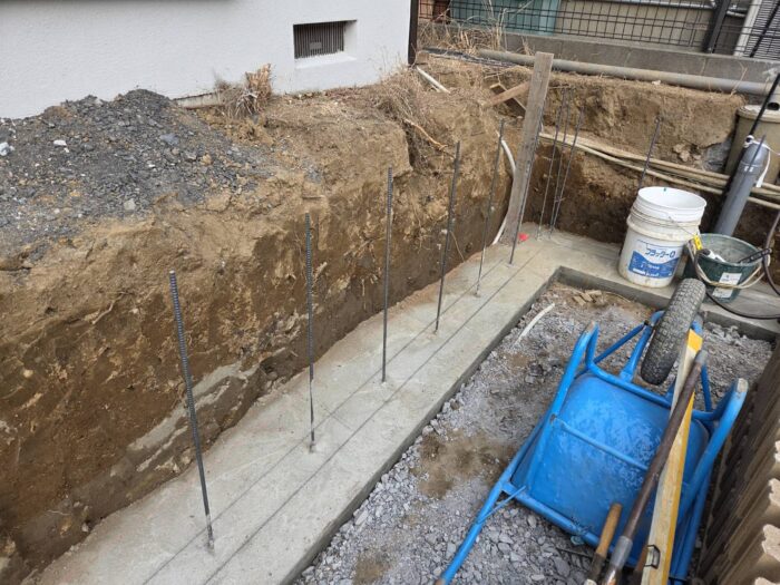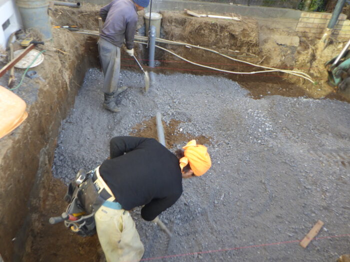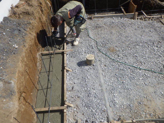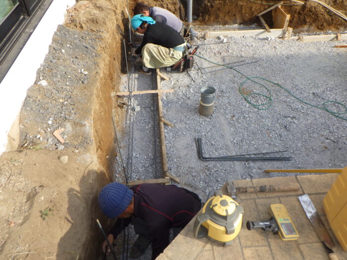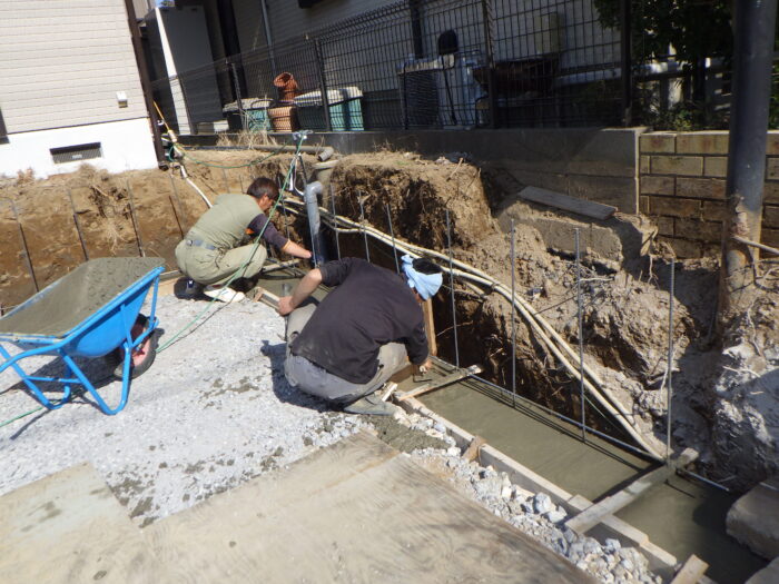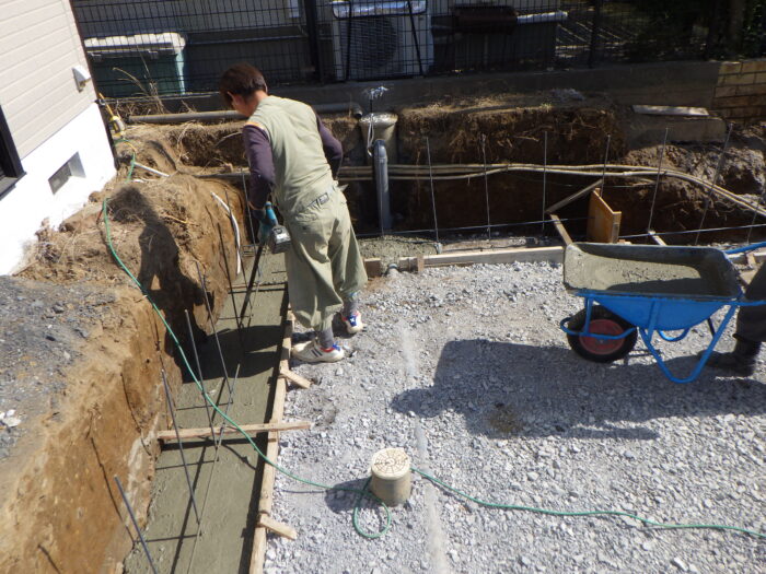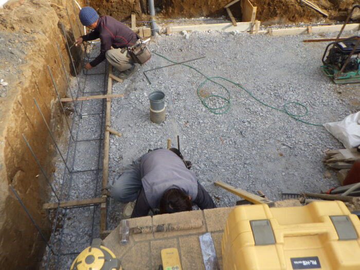 ≪配筋・ベースコンクリート打設≫砕石地業を終え、鉄筋の加工・組立・型枠組を行い、ベースになるコンクリートをミキサー車から一輪車を使い打ち込みます。鉄筋の使用によりコンクリートの強度を高め、ベースコンクリートの打設になります。