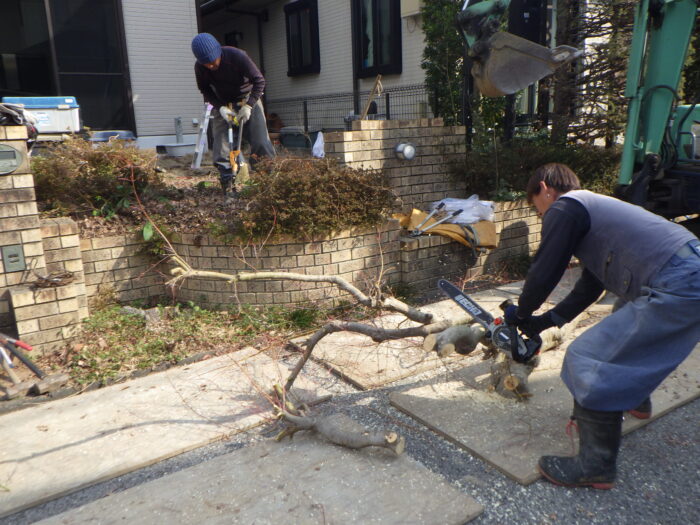 ≪花壇や塀を解体撤去して駐車場を拡張≫ 駐車場を増やしたい場合は敷地の形状や家の配置などを考慮して、必要に応じ花壇撤去の前に植えてある樹木の伐採や植木の移植をしてからのスタートになります。