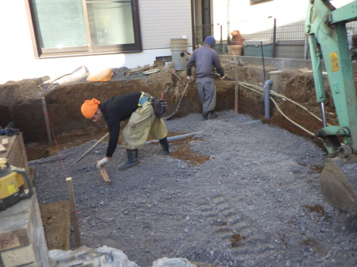 ≪砕石地業≫  砕石にも色々な種類がありますが、使用したのは、C40-0と呼ばれる砕石です。 採石場で採取された岩を、 クラッシャーで砕いたものです。 C-40とは、砕石の一つ一つの粒が0mm~40mmの大きさの物でプレート転圧で締め固めやすい砕石になります。